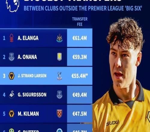 德转统计英超除BIG6外历史最贵交易:纽卡6140万欧签埃兰加第1
