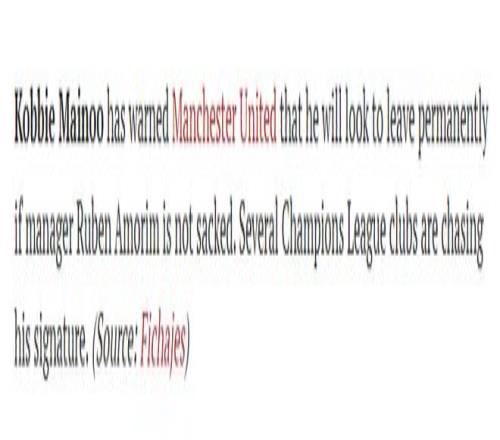 人们很难想象梅诺会有机会在下轮做客安菲尔德的英超「双红会」里首发,预计他将继续板凳坐穿。西班牙「Fichajes转会网」称,梅诺已经向曼联发出最后通牒,表示如果阿莫林没有下课,他将永久转会离队。