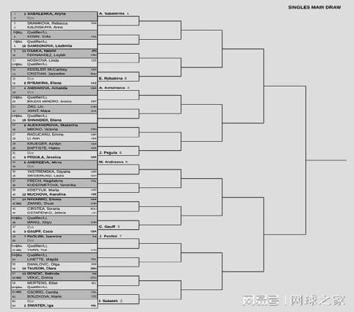 我们再来关注武网。北京时间昨天下午,WTA1000武网公布了正赛签表。女单前八种子对位:上半区,萨巴伦卡一莱巴金娜、阿尼西莫娃-佩古拉;下半区,高芙-米拉-安德列娃、斯瓦泰克-鲍里妮。中国球员方面:张帅VS纳瓦罗、朱琳VS乔恩特、王欣瑜和袁悦VS资格赛球员。