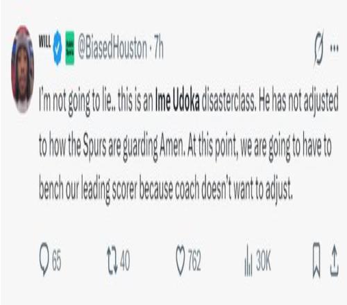 北京时间1月29日,火箭在主场被马刺逆转16分吞下惨败,从领先16分到惨败12分,里外里被马刺翻过去28分,这场比赛火箭在下半场进攻端先开始崩盘,紧接着防守端的积极性也丧失了,申京20投7中,阿门23投11中,而杜兰特17投8中,找不到主攻点成为失利要因。