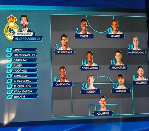 皇马首发:库尔图瓦/巴尔韦德、劳尔·阿森西奥、怀森、卡马温加/居莱尔、楚阿梅尼、贝林厄姆/马斯坦托诺、姆巴佩、维尼修斯