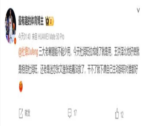 有博主也认为杜锋的用人很有问题,三个老将实际上应该少用,杜润旺状态不佳还硬用,王洪泽明显比杜润旺好使,而且痴迷用张文逸、张皓嘉。