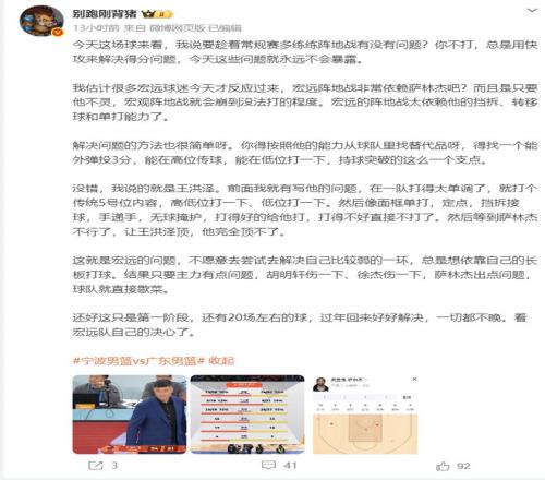 广东需要培养一个本土球员可以替代萨林杰功效的球员,能外弹三分、高位策应、低位强打、持球突破的这样一个点,王洪泽是一个不错的人选,目前他在广东的战术地位过于单一。广东不解决自己的软肋只要出现小问题就会习惯性崩盘。